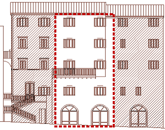 Passando poi ad esaminare nel dettaglio la facciata del palazzo Campanelli notammo che essa presentava spazi utili ad accogliere l’orologio soltanto in corrispondenza delle zone di parete delimitate da gruppi di finestre “in quadrato”. Numerose di queste zone si offrivano sulla facciata, ma non tutte erano adatte, per motivi facilmente spiegabili. Dividemmo questo elementare esame in due fasi: una sulla collocazione orizzontale ed una su quella verticale dell’orologio.